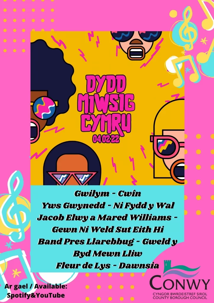 Friday 4th February is Dydd Miwsig Cymru 2022 Welsh Language Music Day. Listen to and enjoy the songs in the poster and use the link below to vote for your favourite! Remember to vote by the day, 4/2/22.