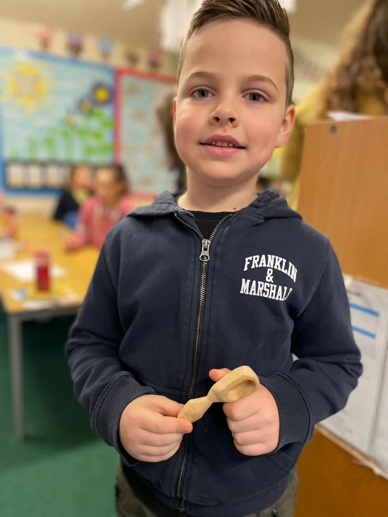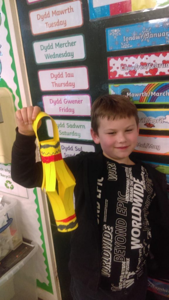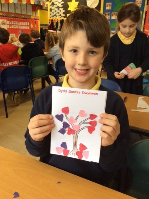 For his excellent listening skills during our Welsh lesson. He carefully followed the instructions to create a beautiful Santes Dwynwen card.